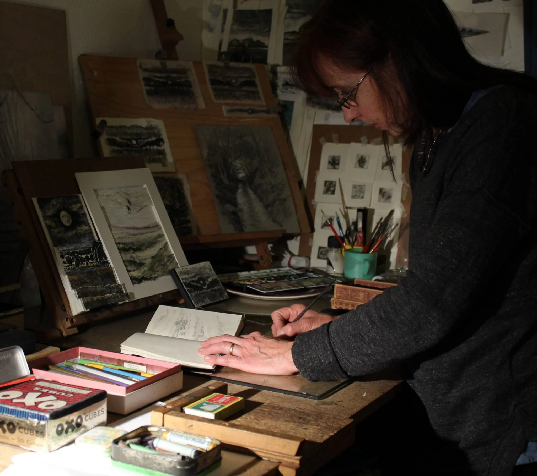 I have had some wonderful teachers, who continue to inspire me. My Hexham High School teachers Mike and Margot still keep an eye on me! My Foundation tutor from Manchester, Don McKinlay set a discipline and pace of working, always asking “What did you do last night?” (and the answer was not to be “went out....”!) Tony Ratcliffe taught the absolutely essential solid techniques of Printmaking, and a love of mountains. On degree in Sheffield it was Stan Jones who first suggested that it was transient lighting on landscape which I could concentrate on. On post-grad in Chelsea, Richard Beer taught me selection of detail from within the distracting multitude of options. He was so cheerful and happy and had a phrase “Oh, how JOLLY!”, said with such straightforward enthusiasm, it was a marvellous antidote to the ‘artistic angst’ of many other teachers!